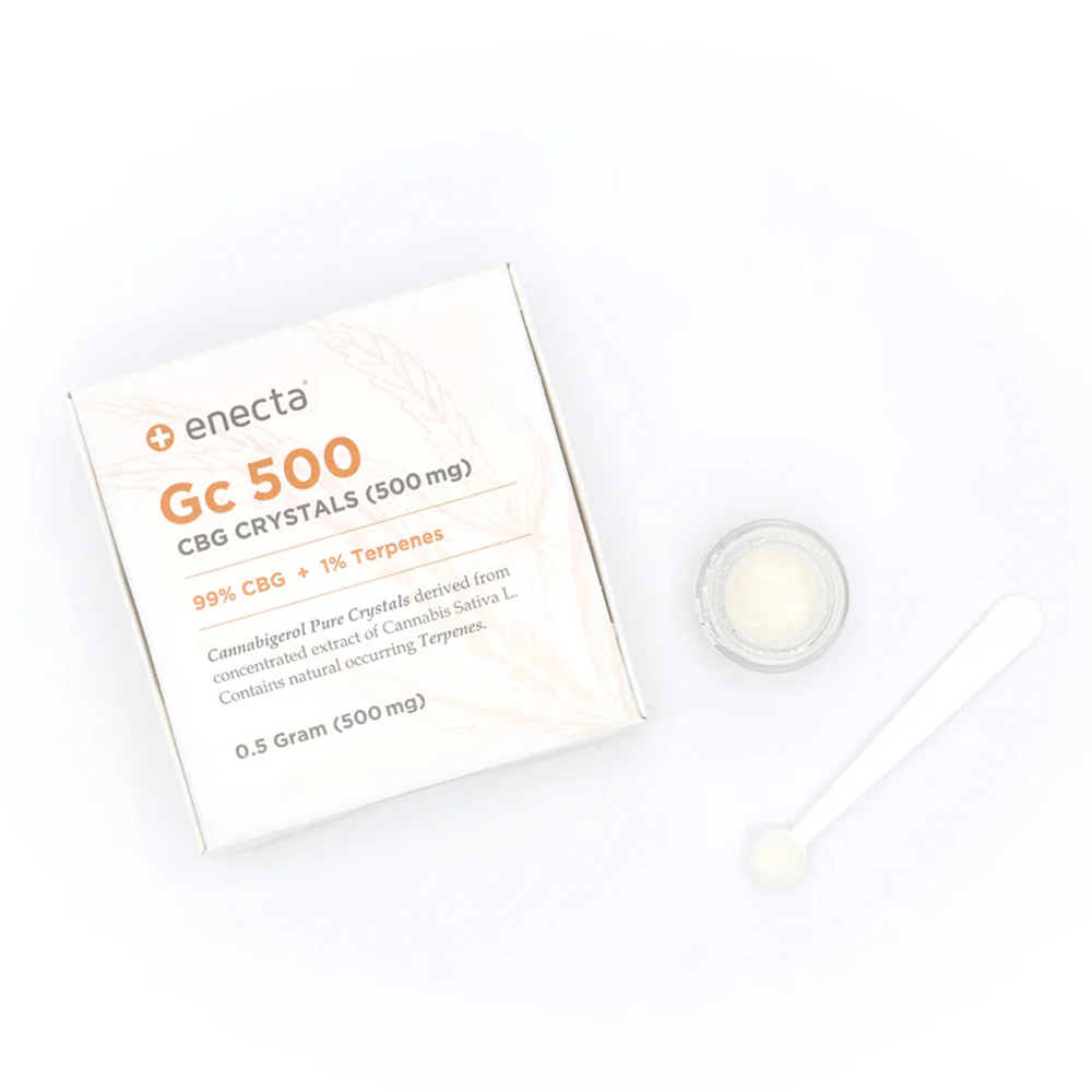 Az Enecta GC500 CBG Kristály a legmagasabb minőségű, 99%-os tisztaságú cannabigerol (CBG) forrás, amelyet organikusan termesztett olasz kendernövényekből nyernek ki. A CBG-t „a kannabinoidok ősének” nevezik, hiszen ez az a vegyület, amelyből a kendernövény más fő hatóanyagai, például a CBD és a THC is kialakulnak. A termék nem pszichoaktív, laboratóriumban bevizsgált és 1% természetes terpént tartalmaz, amelyek fokozzák a CBG hatásait az úgynevezett „entourage effect” révén.